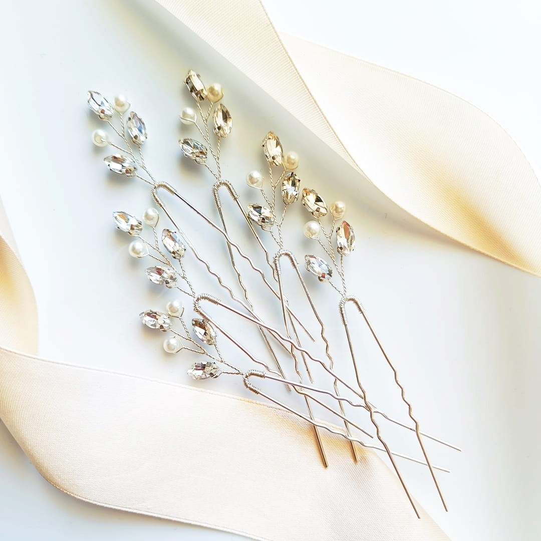 Ozdobne wsuwki do włosów w kolorze srebrnym dodadzą blasku stylizacji. Perełki urozmaicają całą kompozycję podkreślając ich klasę.