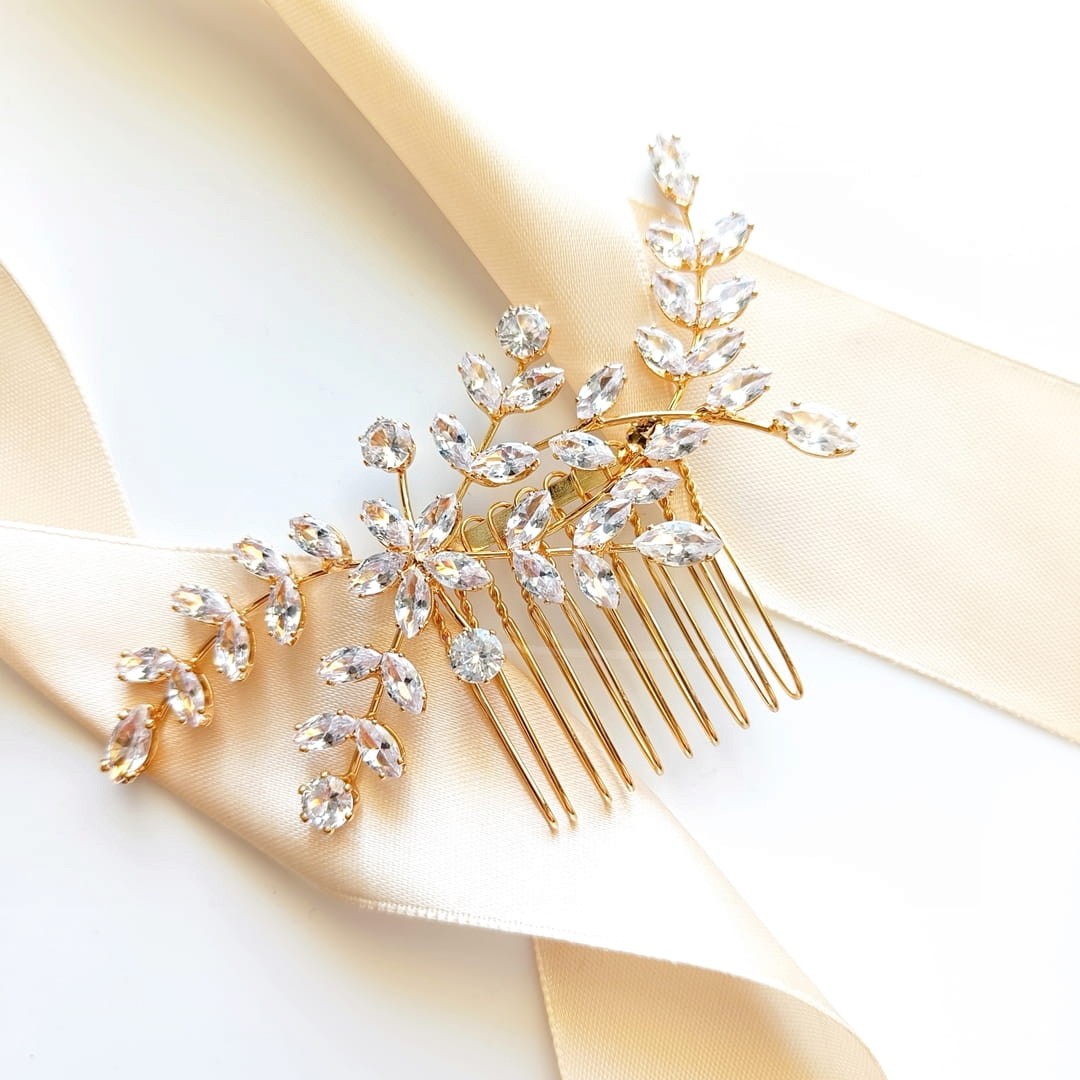 Efektowny złoty grzebień ślubny z rozłożystymi gałązkami i motywem kwiatowym z cyrkonii to propozycja biżuteryjnej ozdoby do koka, bocznego upięcia czy rozpuszczonych włosów. Ozdoba jest dość sztywna, dzięki czemu masz pewność, że żadne taneczne figury nie zmienią jej kształtu.