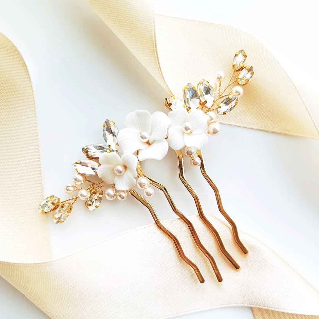 Złoty grzebyk z kwiatami z glinki perełkami i cyrkoniami