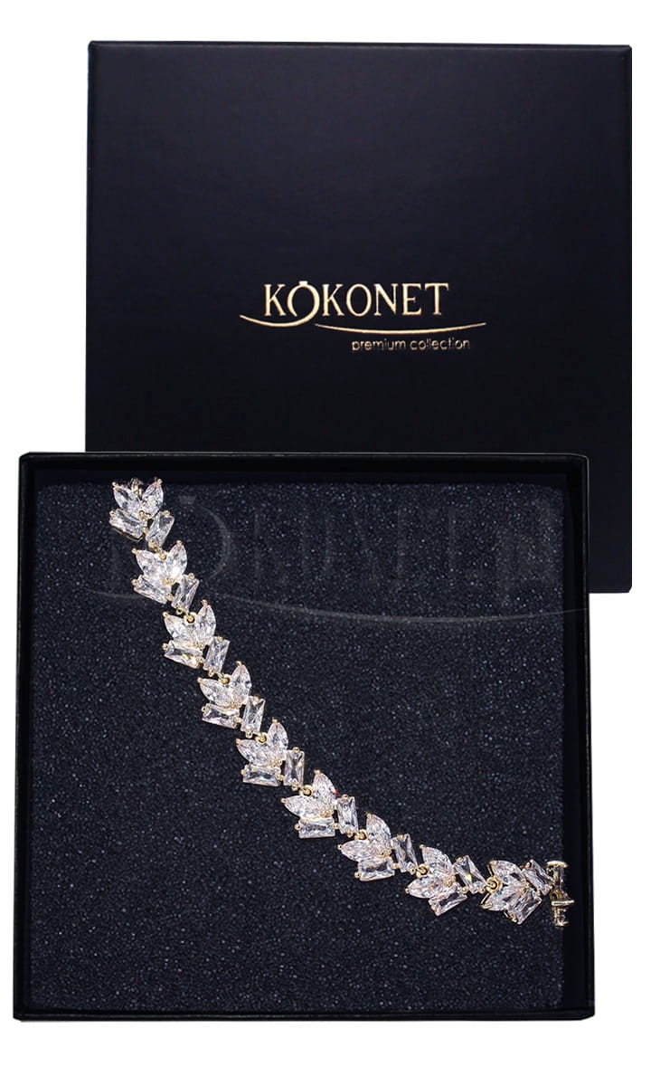 Bransoletka ślubna z diamentowymi cyrkoniami, które pięknie połyskują dodając blasku stylizacji to dodatek, który zasługuje na uwagę. Ten model dopasujesz do większości wzorów z kolekcji PREMIUM, dzięki zastosowaniu cyrkonii w kształcie listków.
