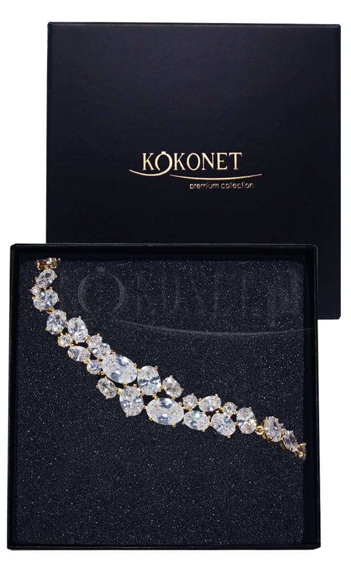 Bransoletka ANASTASIA to jedna z najbardziej okazałych bransoletek kolekcji ślubnej PREMIUM. Dość ścisłe ułożenie cyrkonii w różnych kształtach i wielkościach czyni ją całkiem uniwersalną ponieważ pasuje do większości równie okazałych modeli kolczyków. Za sprawą zapięcia na zatrzask, bransoletka na całej długości wysadzana jest kamieniami, więc pięknie odbija światło.