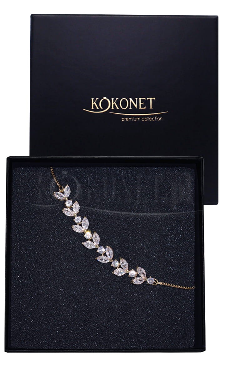 Elegancka złota ślubna bransoletka z motywem listków ASTRID gold. Model bardzo chętnie wybierany z uwagi na uniwersalność - dopasujesz ją do wielu modeli kolczyków z Naszej oferty tworząc harmonijny zestaw biżuterii na ślub. Dzięki regulacji dopasujesz ją do obwodu nadgarstka.