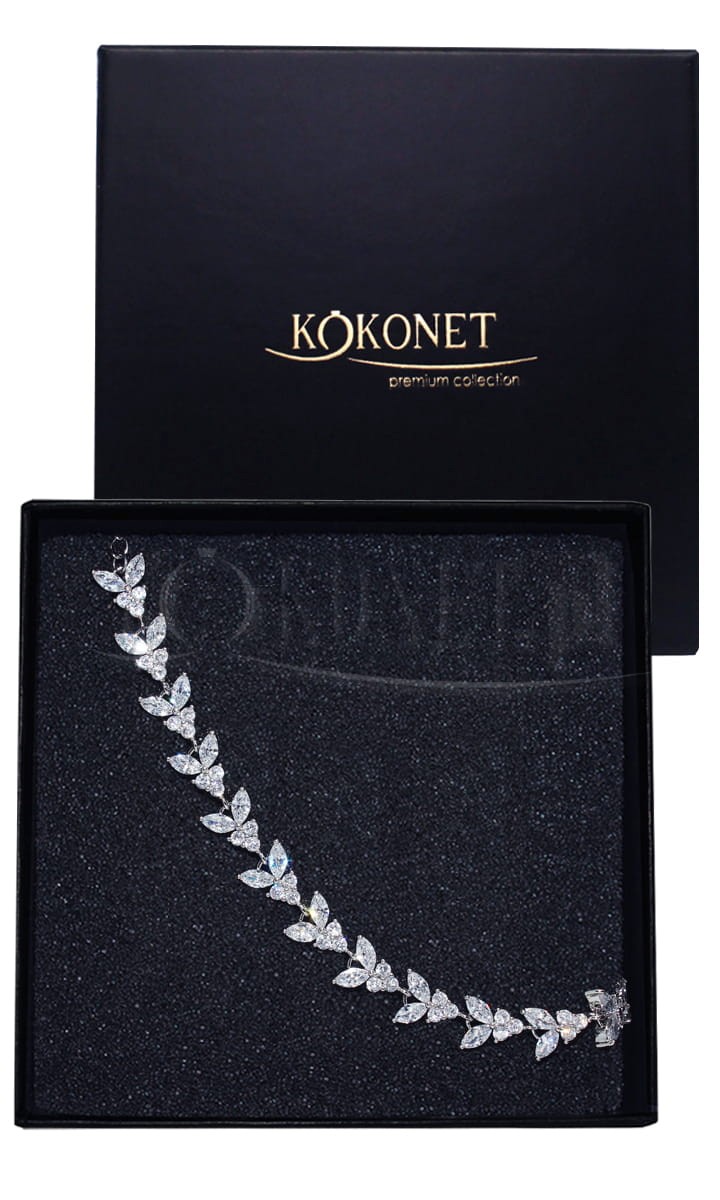 Szukasz bransoletki, która pięknie będzie błyszczeć, będzie jednocześnie widoczna ale również delikatna? Bransoletka ślubna ASTRID jest dla Ciebie! Motyw listków zastosowany w bransoletce będzie stanowił uzupełnienie do wszechobecnych listków w całej ślubnej oprawie. Regulacja za pomocą łańcuszka pozwoli na dowolne dostosowanie bransoletki do nadgarstka.