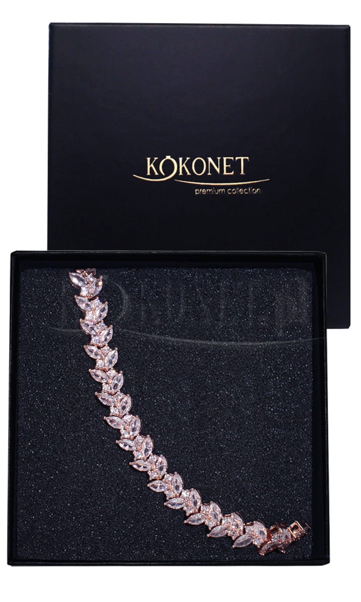 Efektowna bransoletka w kolorze różowego złota wysadzana na całej długości cyrkoniami w kształcie listków i okrągłych cyrkonii w zwartym szyku. Biżuteria zdecydowanie elegancka i pasująca do wielu modeli z serii premium.