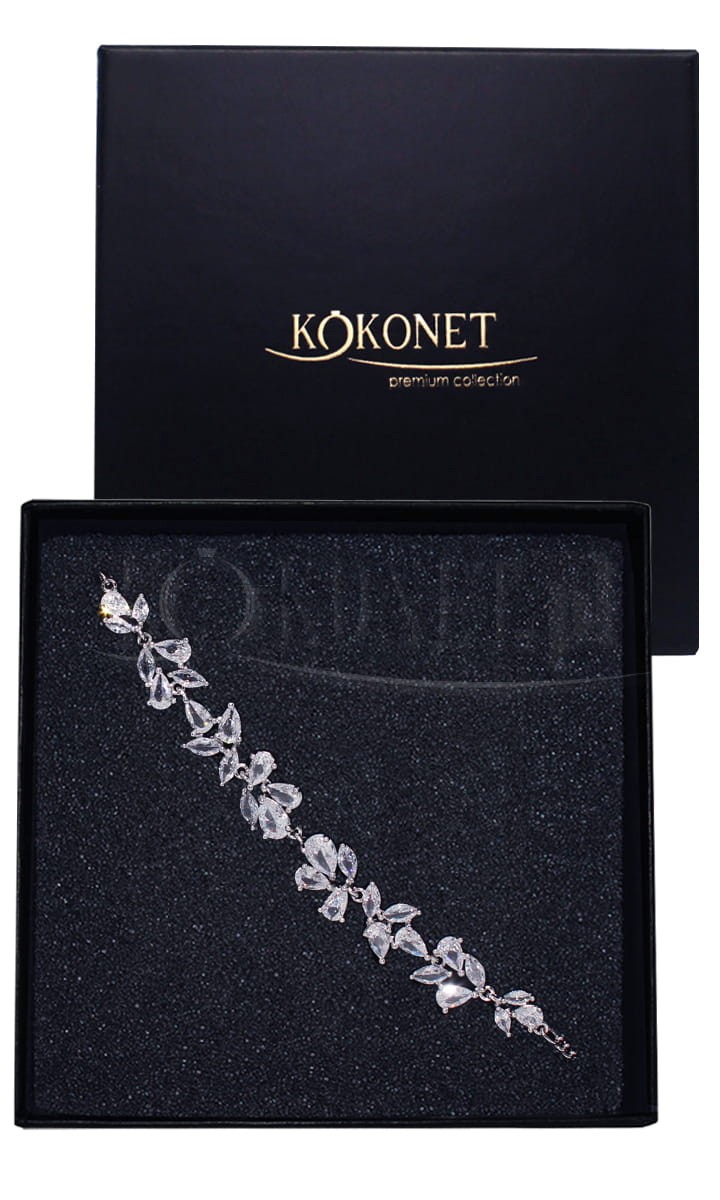 Elegancka i subtelnie błyszcząca srebrna bransoletka z listkami BLANCA powstała, aby ozdobić dłoń przyszłej Panny Młodej. Piękna forma połyskujących listków doda blasku i dopełni ślubny look. Dzięki regulacji możesz dostosować ją dowolnie do swojego nadgarstka.