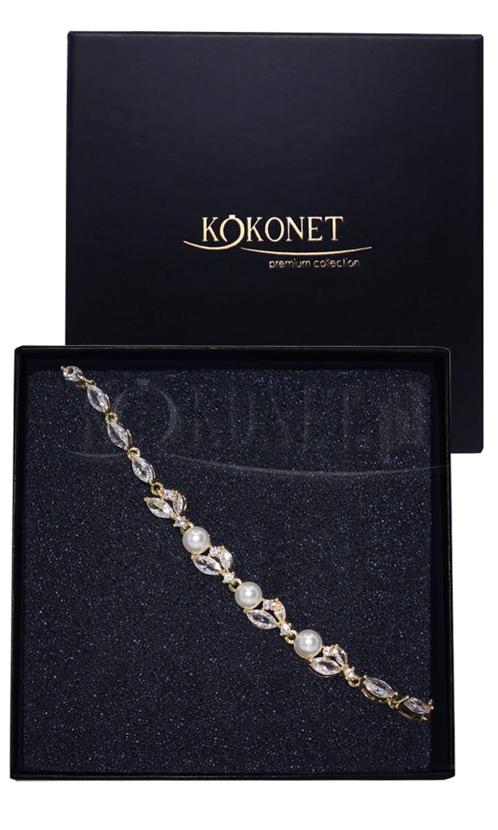 Klasyczna pozłacana ślubna bransoletka z perłami, wysadzana na całej długości zjawiskowo połyskującymi cyrkoniami to uzupełnienie do wytwornej ślubnej kreacji. Perły są wybierane coraz częściej, a w połączeniu z ciepłą oprawą złota wyglądają niesamowicie gustownie.