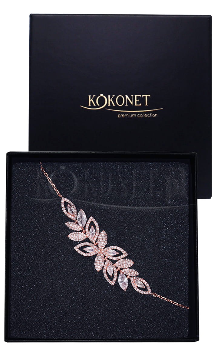 Dalma rose to przykład eleganckiej ślubnej bransoletki z motywem rustykalnym w wydaniu glamur. Biżuterii z tej serii przewodzi motyw listków łączący większe i mniejsze cyrkonie tworząc estetyczną całość. Na końcu strony znajdziesz do kompletu perfekcyjnie dopasowany naszyjnik oraz kolczyki.