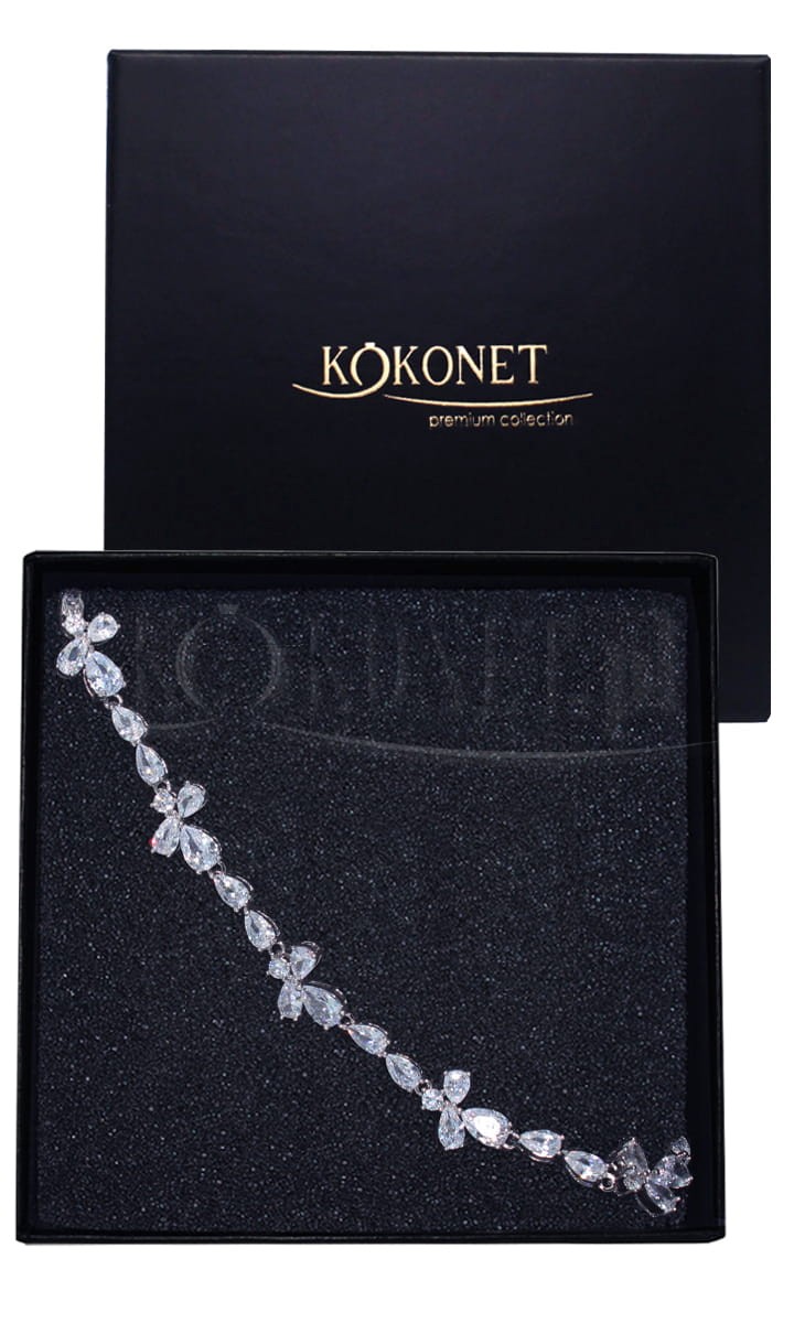 Bransoletka ślubna z listkami, wybierana jest przez Panny Młode szukające uzupełnienia do sukni w stylu boho. Bransoletka jest delikatna, ale dzięki sześciennie szlifowanym cyrkoniom nie brakuje jej pięknego blasku. Zapięcie na karabińczyk i dodatkowa możliwość regulacji stwarza możliwość dopasowania do każdego nadgarstka.