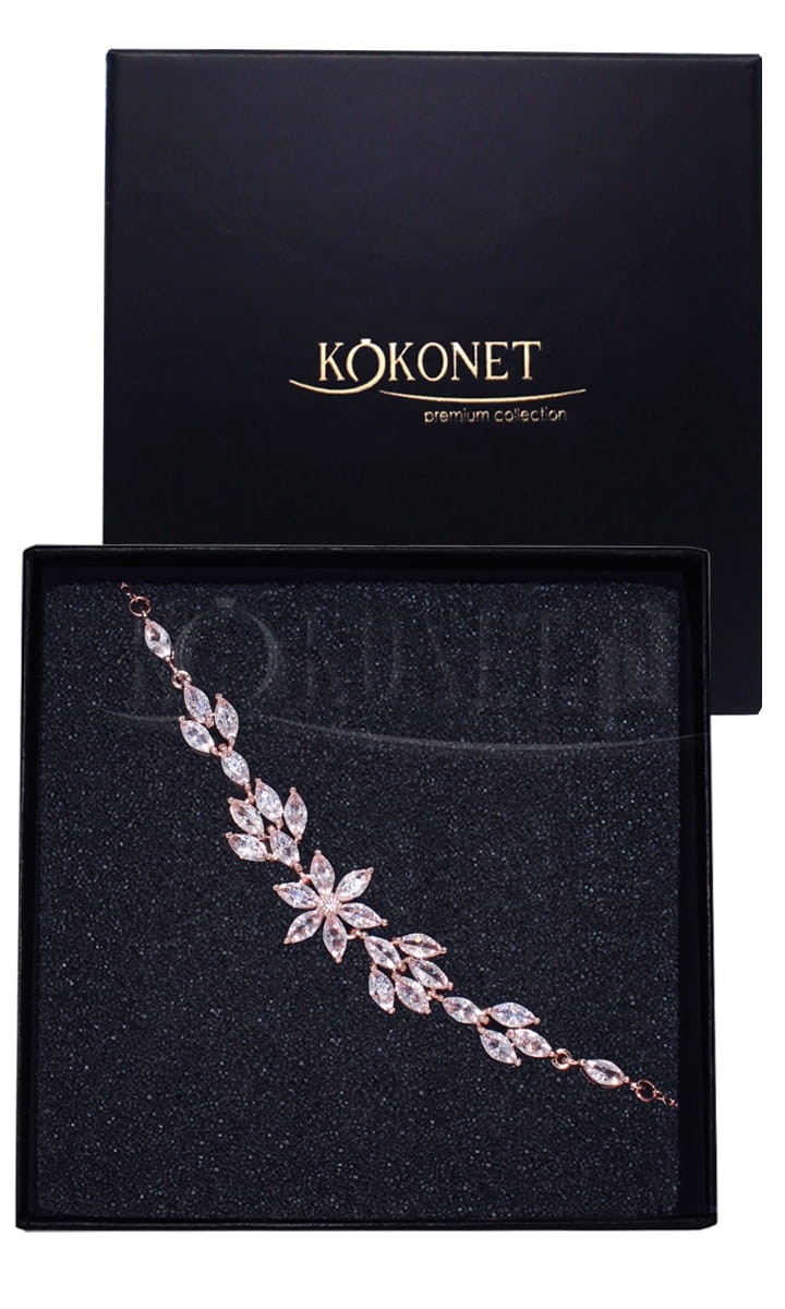 Kwiatowa bransoletka z cyrkoniami w różowym złocie łączy w sobie elementy glamour i boho stając się świetnym wyborem do ślubnych stylizacji. Listki pięknie połyskują w świetle, a bransoletka dzięki regulacji może być założona na każdy nadgarstek.