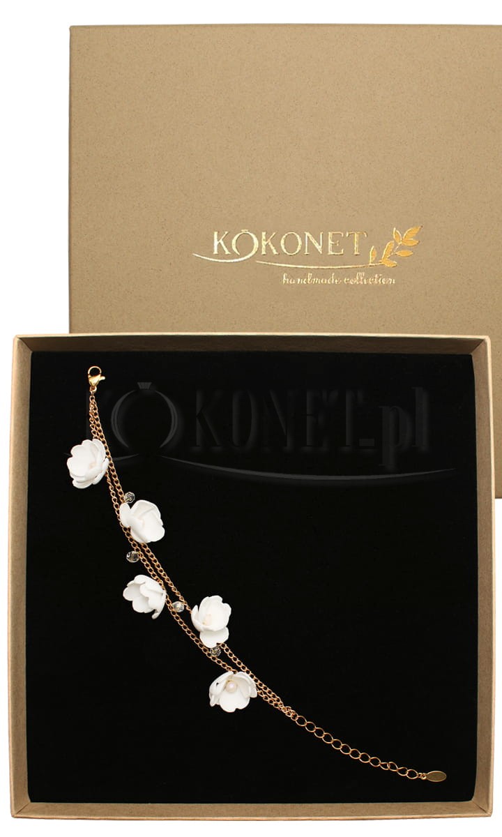 Złota kwiatowa bransoletka PEONY powstała jako uzupełnienie do kompletu biżuterii ślubnej z kolczykami PEONY gold. Dwa rzędy łańcuszków z podwieszonymi kwiatuszkami i kryształkami nawiązuje do romantycznego stylu boho. Lekkość i delikatność to synonimy tej ślubnej biżuterii. Bransoletkę możesz regulować dzięki czemu masz pewność, że będzie odpowiedniej długości. Jeśli potrzebujesz personalizacji w zakresie długości, czy kolorystyki napisz do Nas - chętnie postaramy się sprostać każdemu zadaniu.