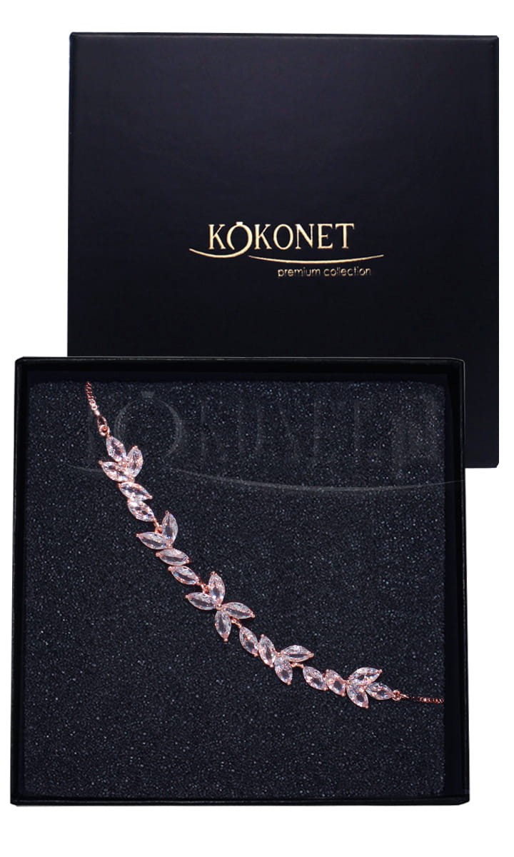 Bransoletka ślubna SEMI dzięki regulacji będzie odpowiednia dla każdej przyszłej Panny Młodej. Motyw przewodni bransoletki stanowią listki, które bardzo często znajdują się w nie tylko wielu elementach ślubnych dekoracji, ale również na samej sukni ślubnej, jak i w ozdobach do włosów. Dzięki szlifowanym sześciennie cyrkoniom bransoletka niesamowicie błyszczy dodając elegancji każdej ślubnej kreacji..