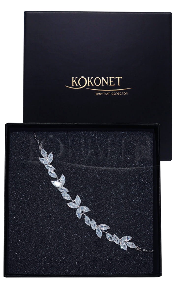 Bransoletka SEMI dzięki regulacji będzie odpowiednia dla każdej przyszłej Panny Młodej. Motyw przewodni bransoletki stanowią listki, które bardzo często znajdują się w nie tylko wielu elementach ślubnych dekoracji, ale również na samej sukni ślubnej, jak i w ozdobach do włosów. Dzięki szlifowanym sześciennie cyrkoniom bransoletka niesamowicie błyszczy dodając elegancji każdej ślubnej kreacji.