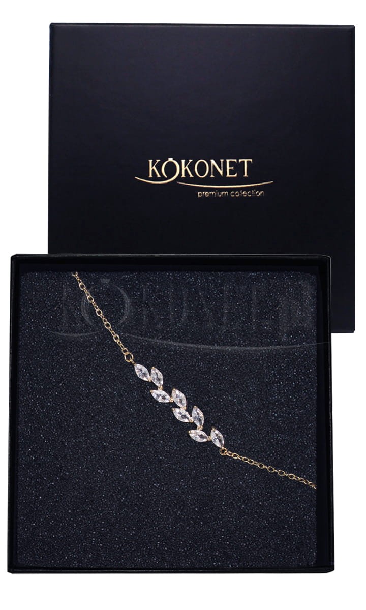Minimalistyczna ślubna biżuteria w formie delikatnej złotej bransoletki na łańcuszku z błyszczącymi listkami stanowić będzie ozdobę nadgarstka Panny Młodej wybierającej równie delikatne kolczyki ślubne czy naszyjnik. Możliwość regulacji zapewni optymalny rozmiar.