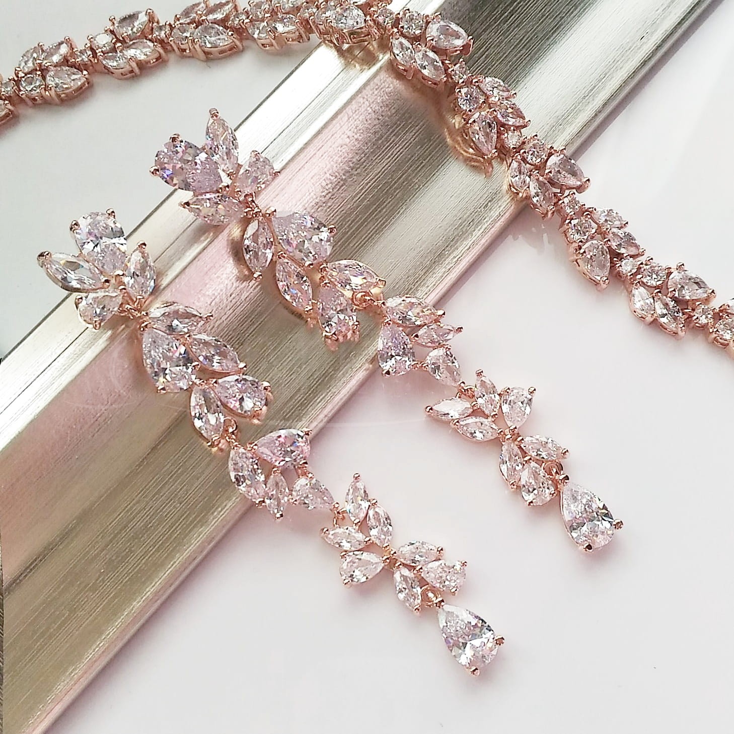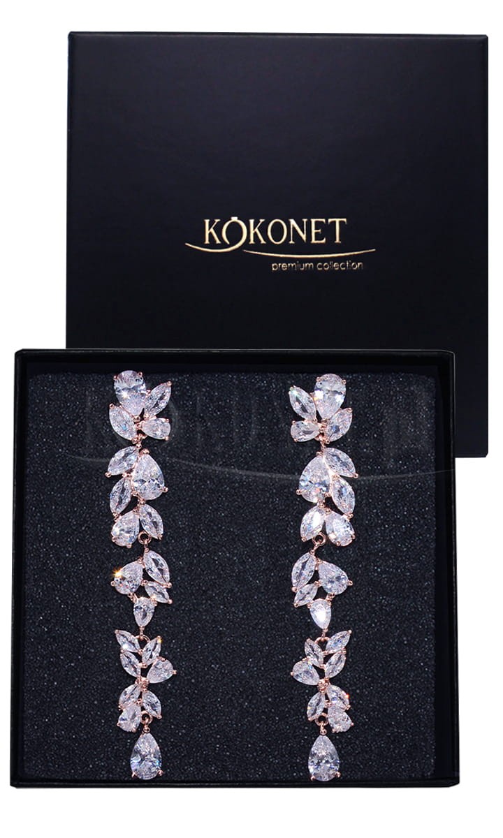 Jedne z najdłuższych kolczyków w Naszej ofercie. Dość okazałe i długie kolczyki ślubne w kolorze rose gold, które pięknie błyszczą podkreślając urodę. Blanca to zdecydowanie kolczyki dla miłośniczek zdobnej biżuterii na ślub.