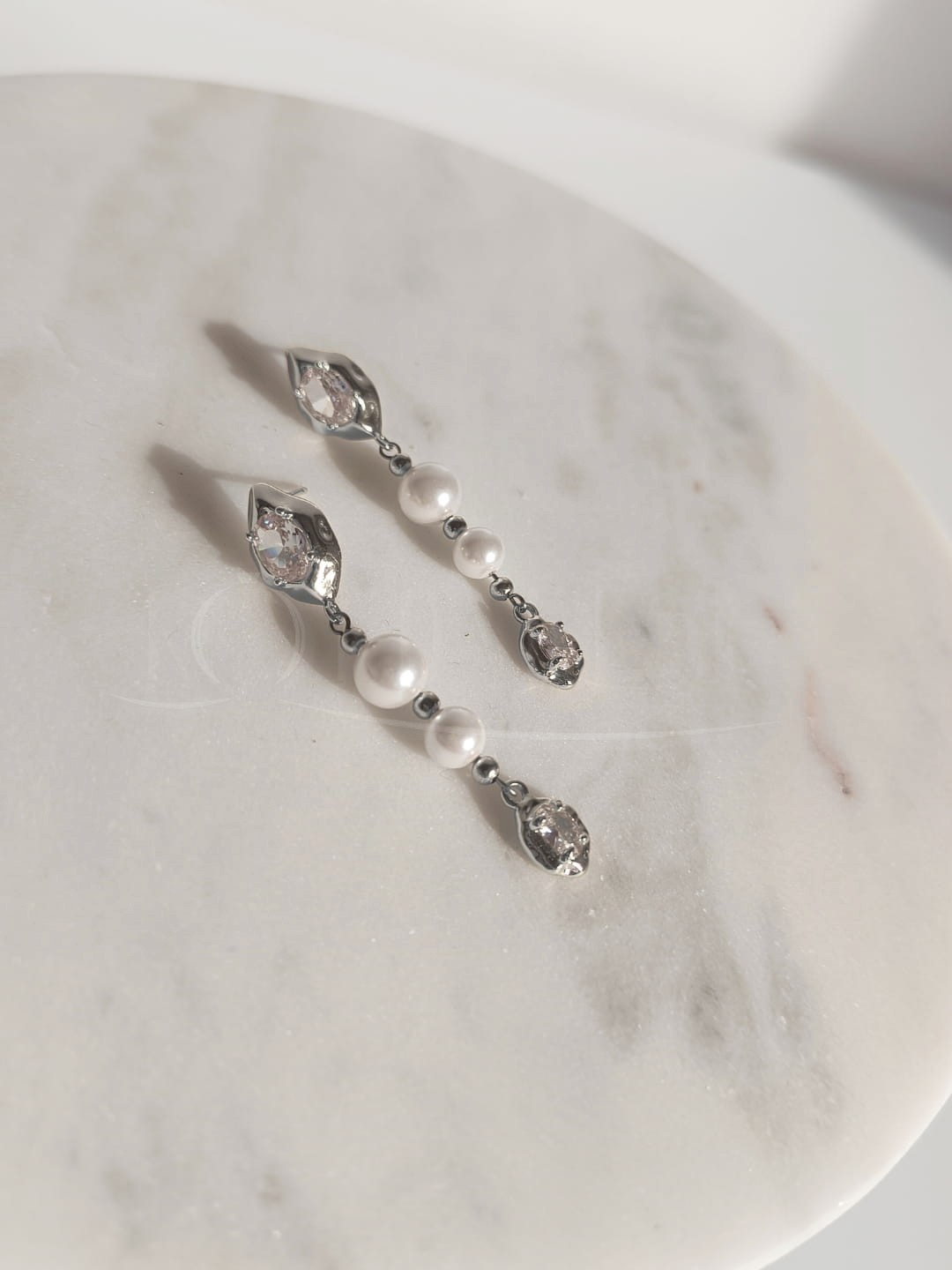 Srebrne długie kolczyki z perłami STELLA to połączenie klasycznego satynowego blasku pereł seashell z nowoczesną nieregularną i lustrzaną formą zapięcia oraz zawieszki. Perły na ślub to wybór ponadczasowy, a w awangardowym wydaniu zasługują na pełną uwagę. Ten unikatowy model ślubnych kolczyków został stworzony w Naszej pracowni z myślą o Pannach Młodych, które szukają dodatków eleganckich, niebanalnych ale w których można powiedzieć "tak".
