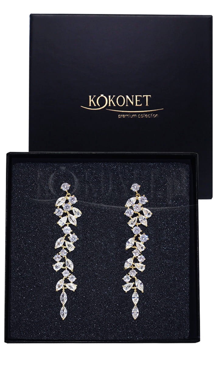 Długie złote kolczyki ślubne z zapięciem na klips przychodzą z pomocą każdej kobiecie, która w dniu ślubu chciałaby przyozdobić uszy, a nie czuje potrzeby ich przekłuwania. Subtelny wzór listków układających się w wysmuklający kształt dopełni stylizację, bez jej przeciążenia.