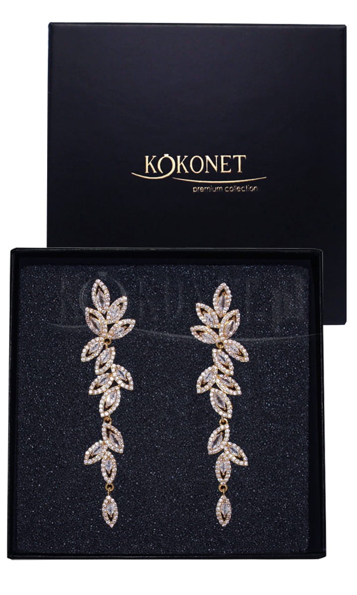 Motyw listków to jeden z najchętniej wybieranych przez Panny Młode motywów ślubnych - nic dziwnego, bo najświeższe trendy mocno nawiązują do natury - drobne listki dodają ponadto lekkości i romantyczności całej ślubnej stylizacji. Złote kolczyki ślubne ALBIONE idealnie wpasuje się do subtelnych sukien ślubnych. Jeśli planujesz włosy rozpuszczone w postaci burzy loków, lub gładko zaczesanych hollywoodzkich fal, to jest to model dla Ciebie. Dzięki swojej długości nie zgubi się pośród kosmyków, a za sprawą błyszczących diamentowych kamieni kolczyki pozostaną widoczne.