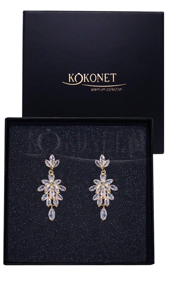 Ślubne wiszące kolczyki w kolorze złota- dzięki opływowemu kształtowi i średniej długości są chętnie wybierane przez przyszłe mężatki. Wyglądają nietuzinkowo, a dzięki cyrkoniom w kształcie listków wpiszą się w stylizacje z motywem florystycznym- boho i rustykalnym.