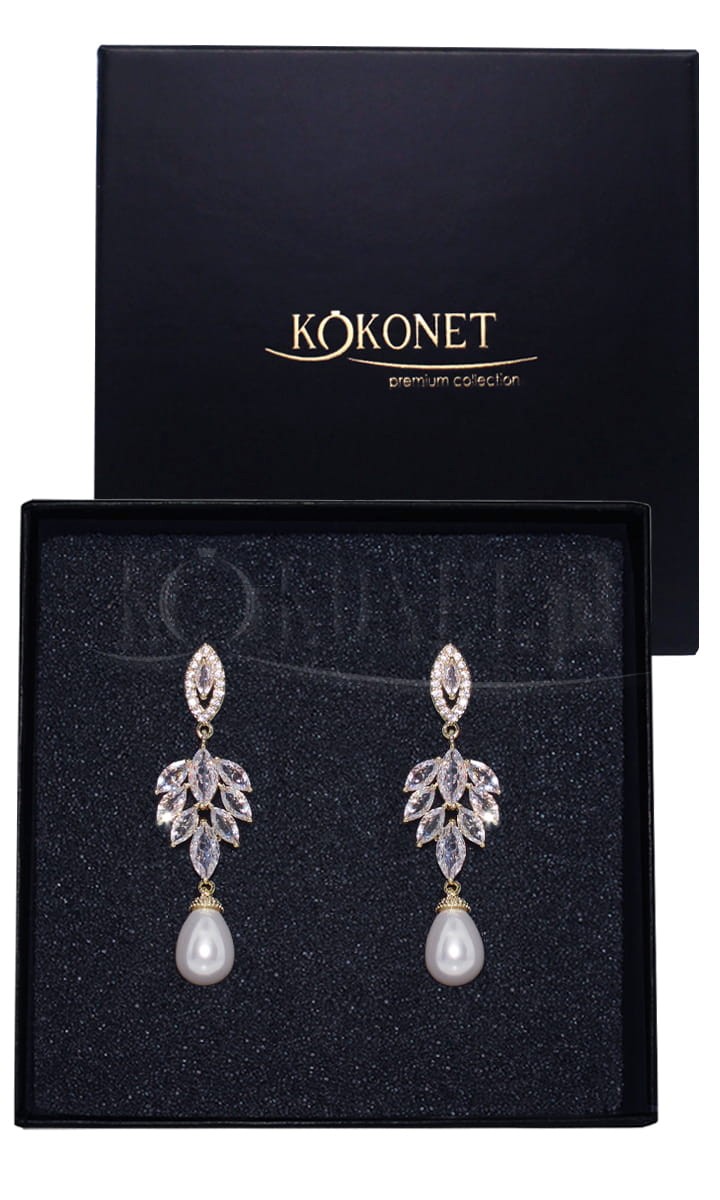 Długie pozłacane kolczyki z perłami i cyrkoniami, które z powodzeniem mogą zostać wybrane do stylizacji ślubnej jak i wieczorowej. Wiszące cyrkoniowe elementy połączone przegubowo z perłą zapewniają tym eleganckim kolczykom dynamikę i dostosowanie do ruchów noszącej je osoby.