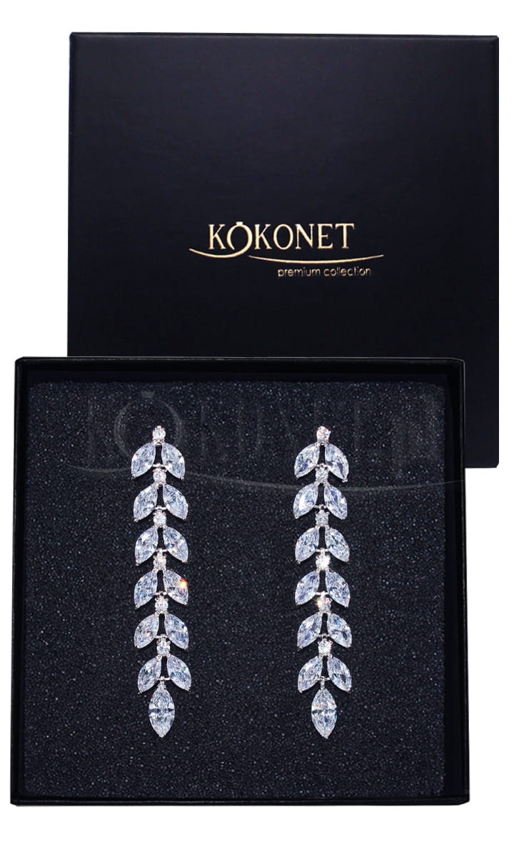 Jedne z dłuższych srebrnych kolczyków na ślub w Naszej ofercie. Wiszące listki z cyrkonii układają się wysmuklający kształt, pięknie przy tym połyskując.