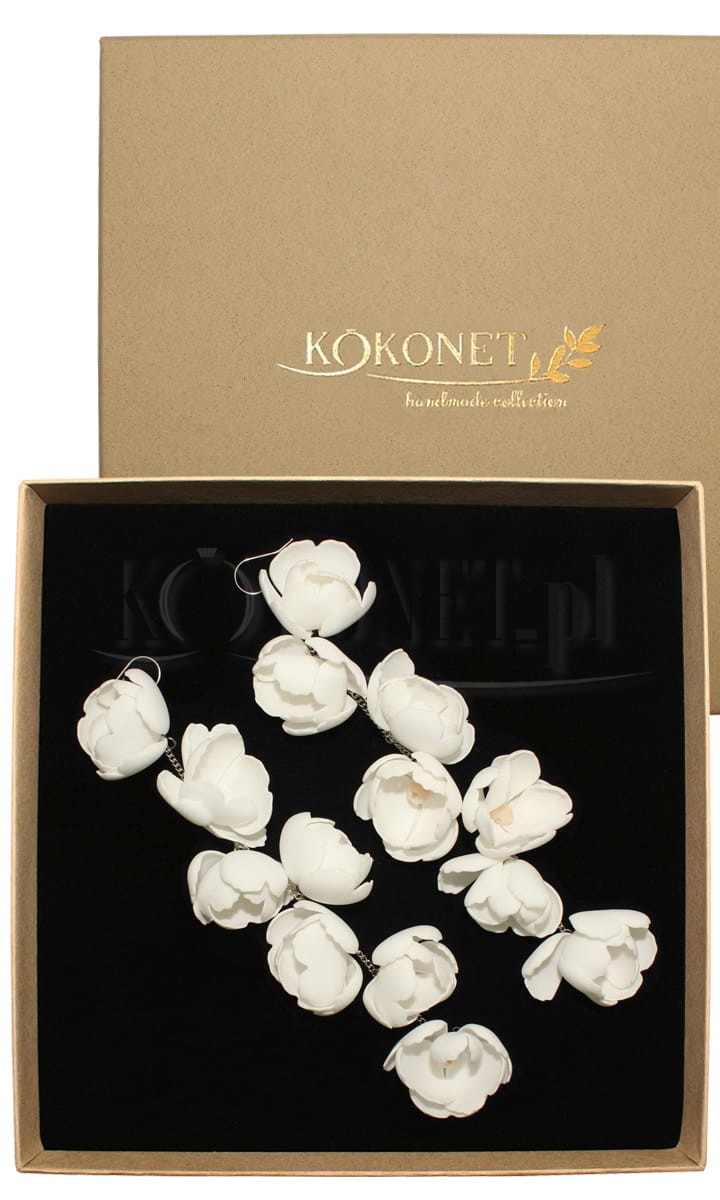 Długie kwiatowe kolczyki ślubne to obecnie najczęstszy wybór Panien Młodych. Kolczyki LIDIA powstały uosabiając marzenia o lekkich girlandach kwiatów zdobiących uszy. Kwiaty są delikatne, formowane ręcznie i podwieszone na łańcuszku, aby móc wdzięcznie kołysać się wraz z ciałem.