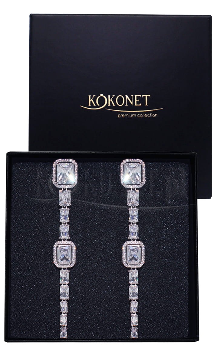 Diamentowe długie srebrne kolczyki LARGO to propozycja dla nowoczesnych Panien Młodych poszukujących wyjątkowych i wyszukanych dodatków ślubnych. Podłużny kształt wysmukla optycznie twarz, a zastosowane kwadratowe cyrkonie w pięknym sześciennym szlifie dodatkowo cudownie ją rozświetlą. Te kolczyki zrobią na wszystkich duże wrażenie.