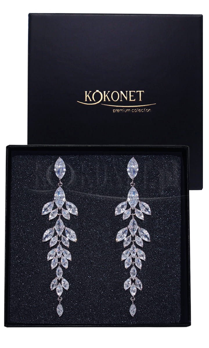 Przebojowe i efektowne, ale pozostające nadal lekkie srebrne kolczyki na ślub MALVA to kompozycja pięknie mieniących się kryształów w podłużnym kształcie. Do tych długich kolczyków z powodzeniem dopasujesz zarówno bransoletkę, jak i naszyjnik czy ozdobę do włosów tworząc czarujący komplet ślubnej biżuterii. Kolczyki są niesamowicie lekkie, a jednocześnie widoczne