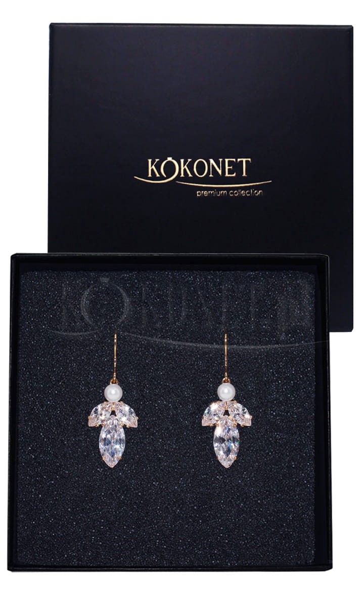 Eleganckie złote wiszące kolczyki z cyrkoniami i perłą SALMA uzupełnią zarówno wieczorowe jak i ślubne suknie. Połączenie klasycznej perły z blaskiem cyrkonii jest bardzo eleganckie i efektowne. Kolczyki będą pasować do upiętych włosów, jak i rozpuszczonych, bo nie zgubią się pomiędzy kosmykami włosów.