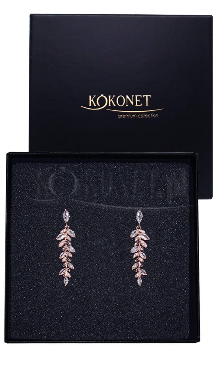 Kolczyki ślubne SIRRI uzupełnią minimalistyczną stylizację, utrzymają w klimacie rustykalnym. Sześcienne szlifowane cyrkonie ułożone w kształcie listków zapewniają błysk pośród opadających swobodnie włosów, a Ty masz pewność nieprzeciążonej stylizacji ślubnej.