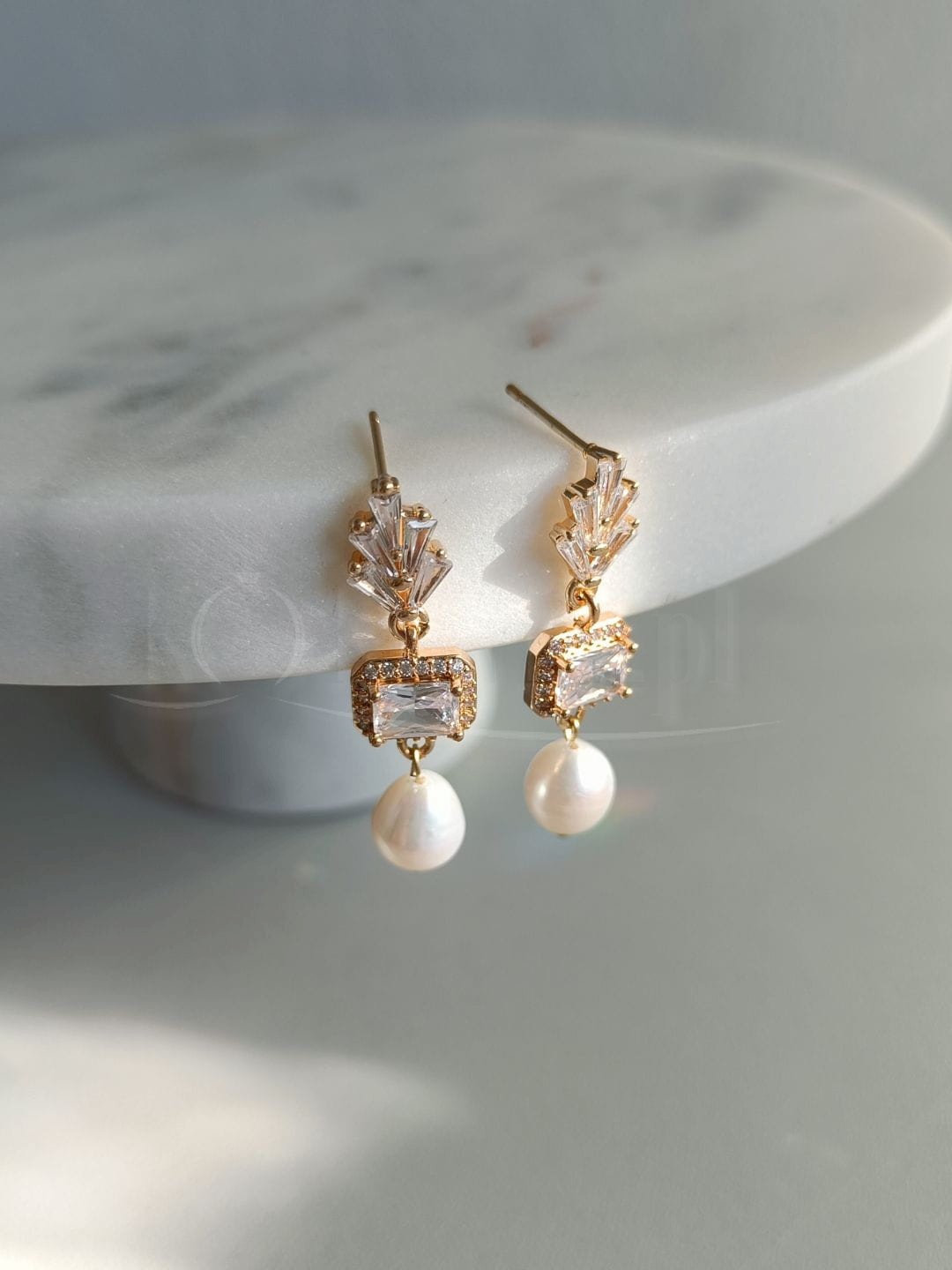 Wiszące kolczyki ślubne z perłą słodkowodną i cyrkoniami MARTINA gold