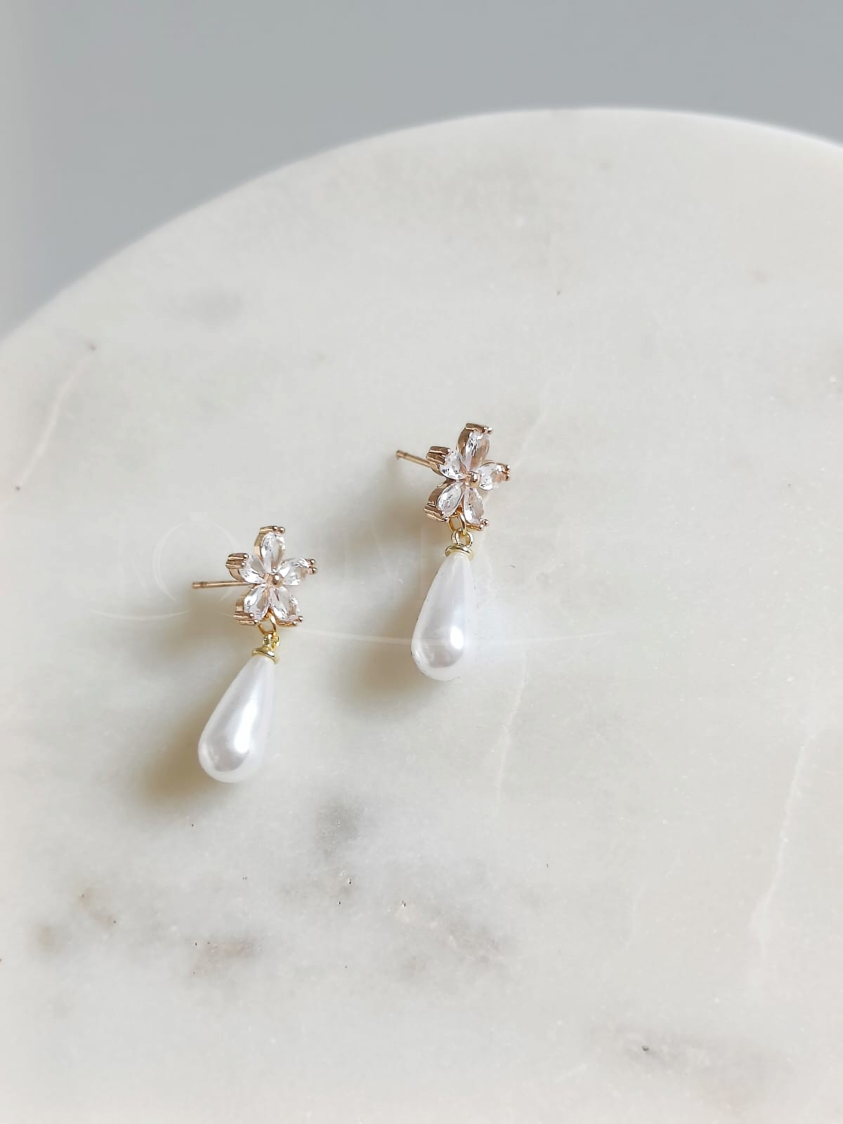 Złote kolczyki kwiatowe z cyrkoniami i perłą FLOR gold