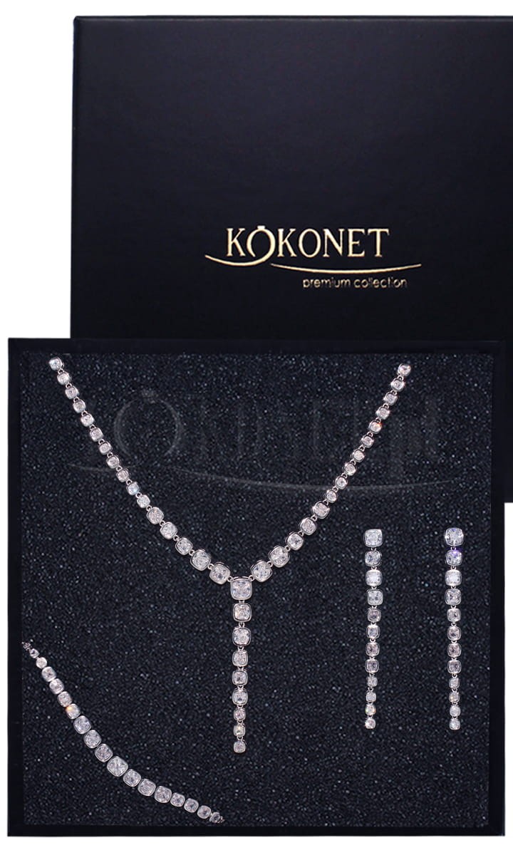 Elegancki i bardzo efektowny zestaw srebrnej biżuterii ślubnej składający się z kolii, długich kolczyków i bransoletki. Geometryczne kształty cyrkonii oprawianych obwodowo połączone w wysmuklające formy pięknie błyszczą ozdabiając ślubną stylizację i podkreślając jej wyjątkowy charakter. Wybierz go, jeśli szukasz oszałamiającej ale przy tym maksymalnie eleganckiej biżuterii.