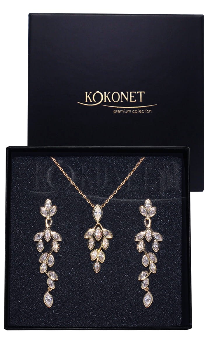 Podkreśl swoją stylizację dzięki naszemu efektownemu kompletowi biżuterii ślubnej w kolorze złotym NABLA. Ten delikatny zestaw, składający się z naszyjnika i kolczyków, zachwyca motywem pnączy z błyszczącymi listkami. Cyrkonie pięknie odbijają światło, przyciągając uwagę, a motyw roślinny dopasujesz do większości typów koronki, czy dopasujesz do gładkich sukni. Jest to zestaw biżuterii dla Panien Młodych szukających delikatnych, ale efektownych i lekkich dodatków na swój wielki dzień.