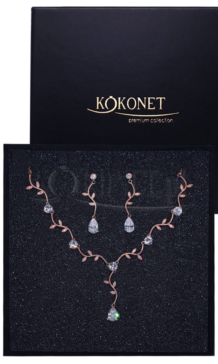 Lekki zestaw biżuterii na ślub w stylu boho - kolczyki i naszyjnik. Motyw pnącza z maleńkimi listkami otuli Cię nieśmiało blaskiem i podkreśli rustykalny charakter ślubnego outfitu.