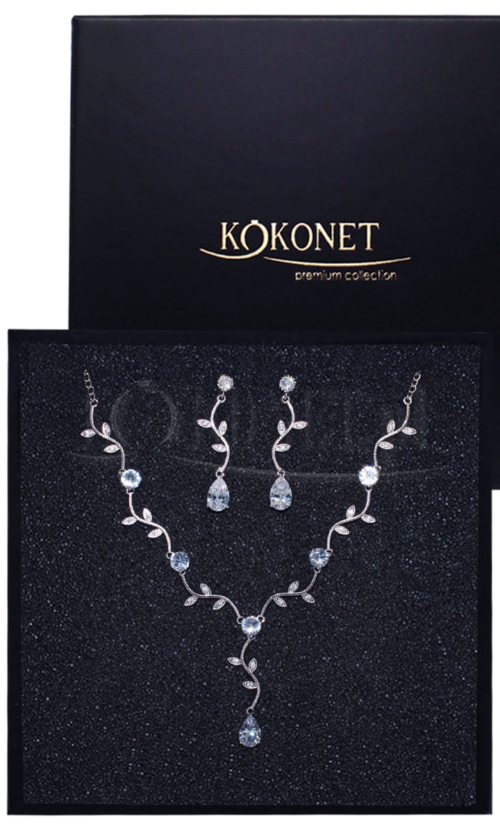 Lekki zestaw srebrnej biżuterii ślubnej w stylu boho w postaci naszyjnika i kolczyków. Motyw pnącza z maleńkimi listkami otuli Cię nieśmiało blaskiem i podkreśli lekkość stylizacji.