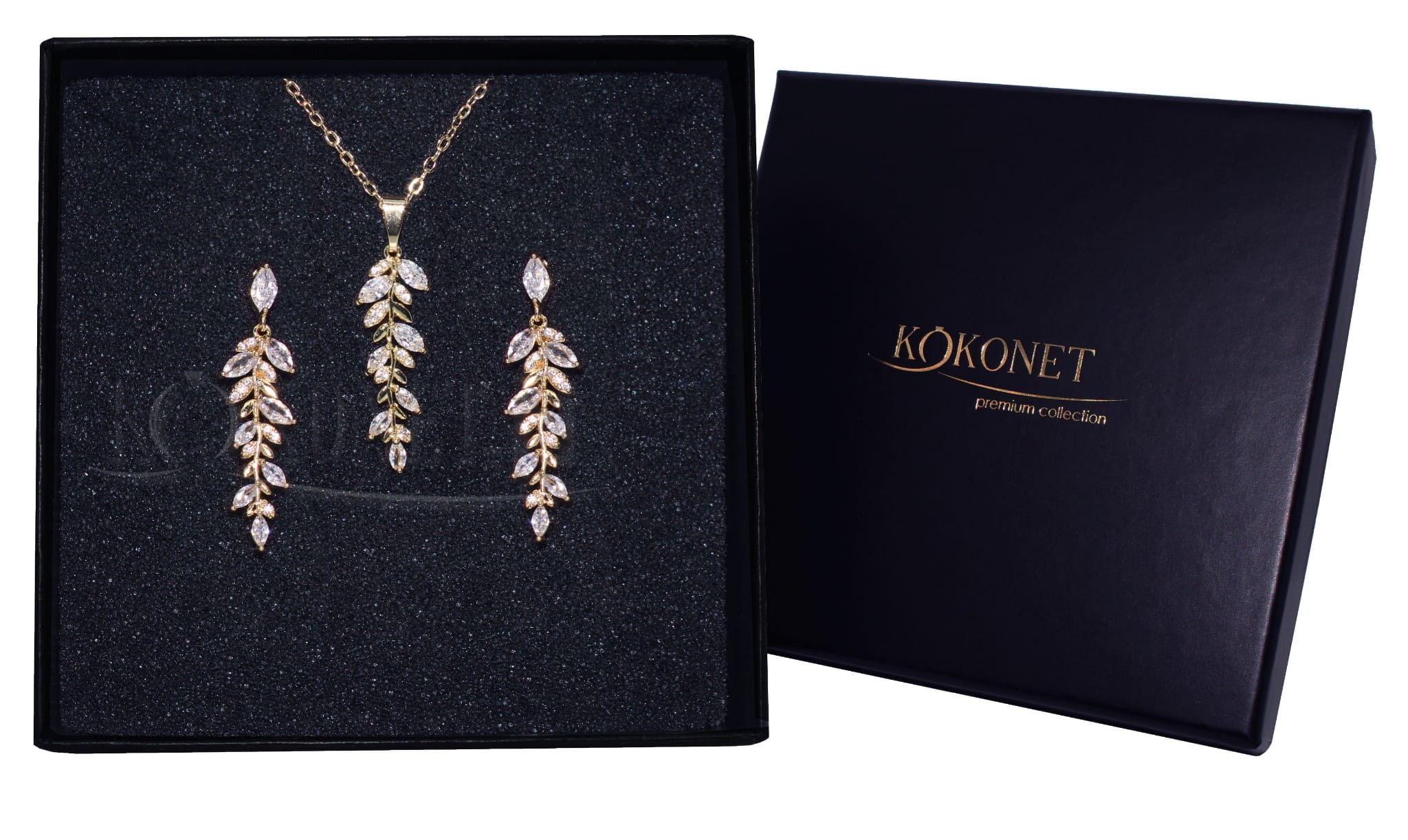 Delikatny komplet biżuterii ślubnej z listkami ozdobi ślubną stylizację i podkreśli jej naturalność. Eleganckie kolczyki ślubne złote z pięknie dopasowanym naszyjnikiem boho w komplecie stanowić będą nowoczesny i błyszczący zestaw biżuterii na ślub.