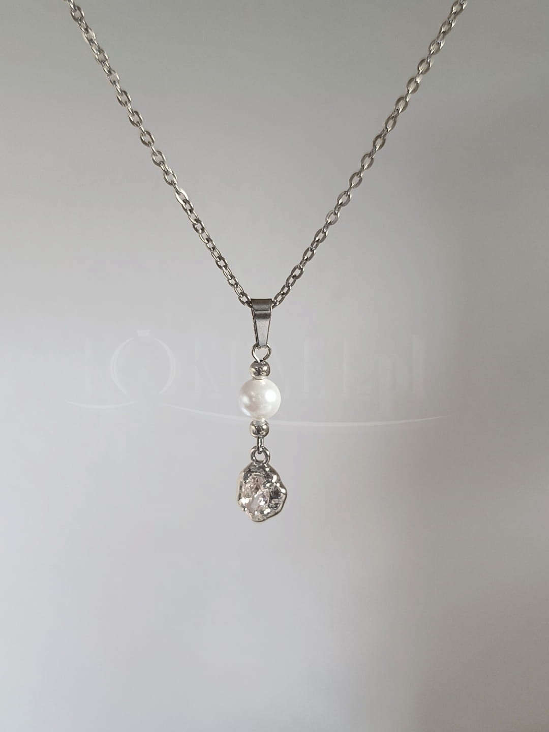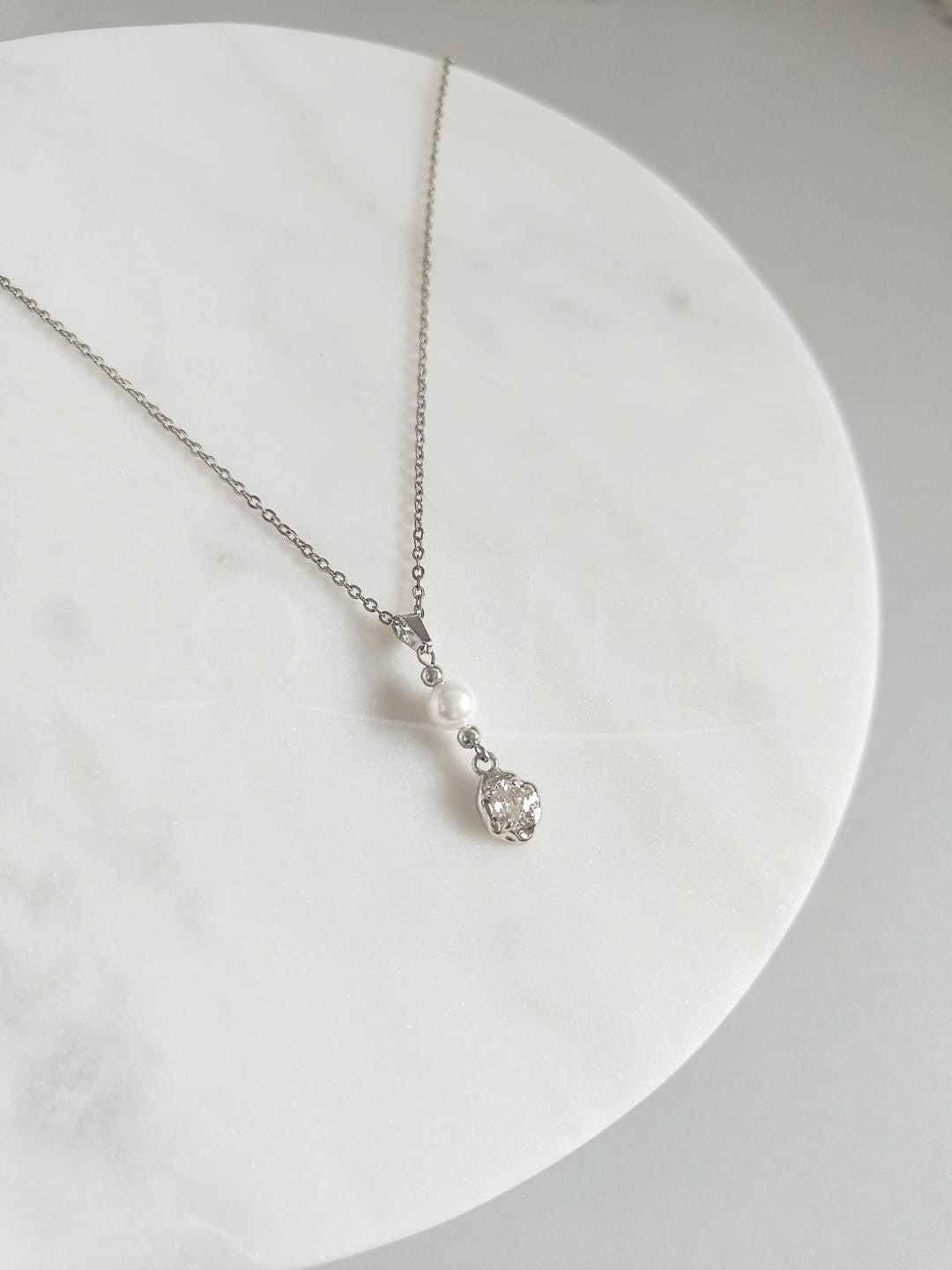 Delikatny i elegancki srebrny naszyjnik z perłami STELLA to połączenie klasycznego satynowego blasku pereł seashell z nowoczesną nieregularną i lustrzaną formą zawieszki. Naszyjnik został zaprojektowany tak, aby tworzyć perfekcyjny zestaw biżuterii ślubnej z kolczykami i bransoletką z tej samej serii. Wybierz go jeśli szukasz delikatnego uzupełnienia swojej ślubnej stylizacji.
