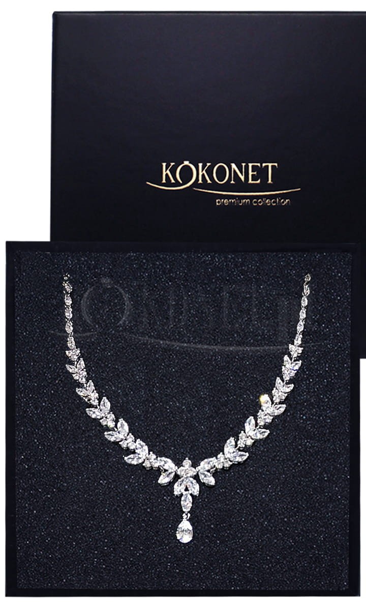 Szukasz kolii która pięknie będzie błyszczeć, będzie jednocześnie widoczna ale również delikatna? Kolia ASTRID jest dla Ciebie! Motyw listków z zaakcentowanym centralnym punktem naszyjnika pięknie podkreśli ślubne suknie z dekoltem w literę "V" dodając im szyku i elegancji. Ręcznie oprawiane kamienie w diamentowym szlifie sprawią że rozpromieniejesz.