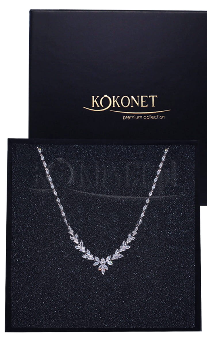 Kolia ślubna z diamentowymi cyrkoniami w kształcie listków to typ biżuterii ślubnej idealnej dla sukien z wyciętymi dekoltami. Z łatwością dopasujesz do niej pasujące kolczyki aby cała stylizacja wyglądała spójnie i czarująco. Dzięki swojemu kształtowi stanowi jeden z najchętniej wybieranych przez Panny Młode naszyjników.