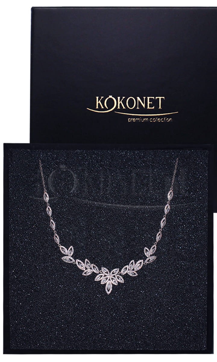 Naszyjnik ALBIONE silver polecamy Pannom Młodym szukającym zdecydowanie efektownej i olśniewającej biżuterii ślubnej. Cyrkonie w kształcie listków pięknie połyskują, a kształt naszyjnika będzie odpowiedni zarówno dla sukien z dekoltem w literę „V” jak i tych o prostej linii.