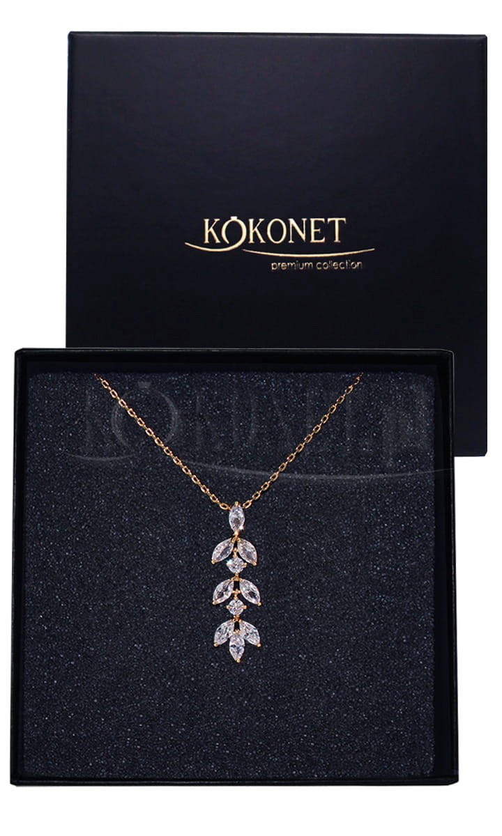 Pozłacany wiszący naszyjnik, który proponujemy założyć do sukien ślubnych czy wizytowych podkreślając ich elegancję. Listki pasują do wielu modeli kolczyków w Naszej ofercie. Propozycje pasującej biżuterii do kompletu w dolej części tej strony.