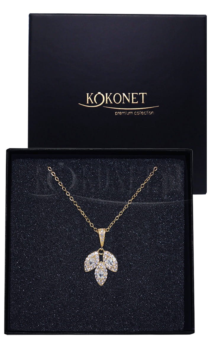 Rustykalna złota biżuteria ślubna w postaci naszyjnika BOGGIA to elegancja i klasa w jednym. Delikatne listki w całości wysadzone wieloma kryształkami zwrócą uwagę fanek minimalizmu, i blasku.