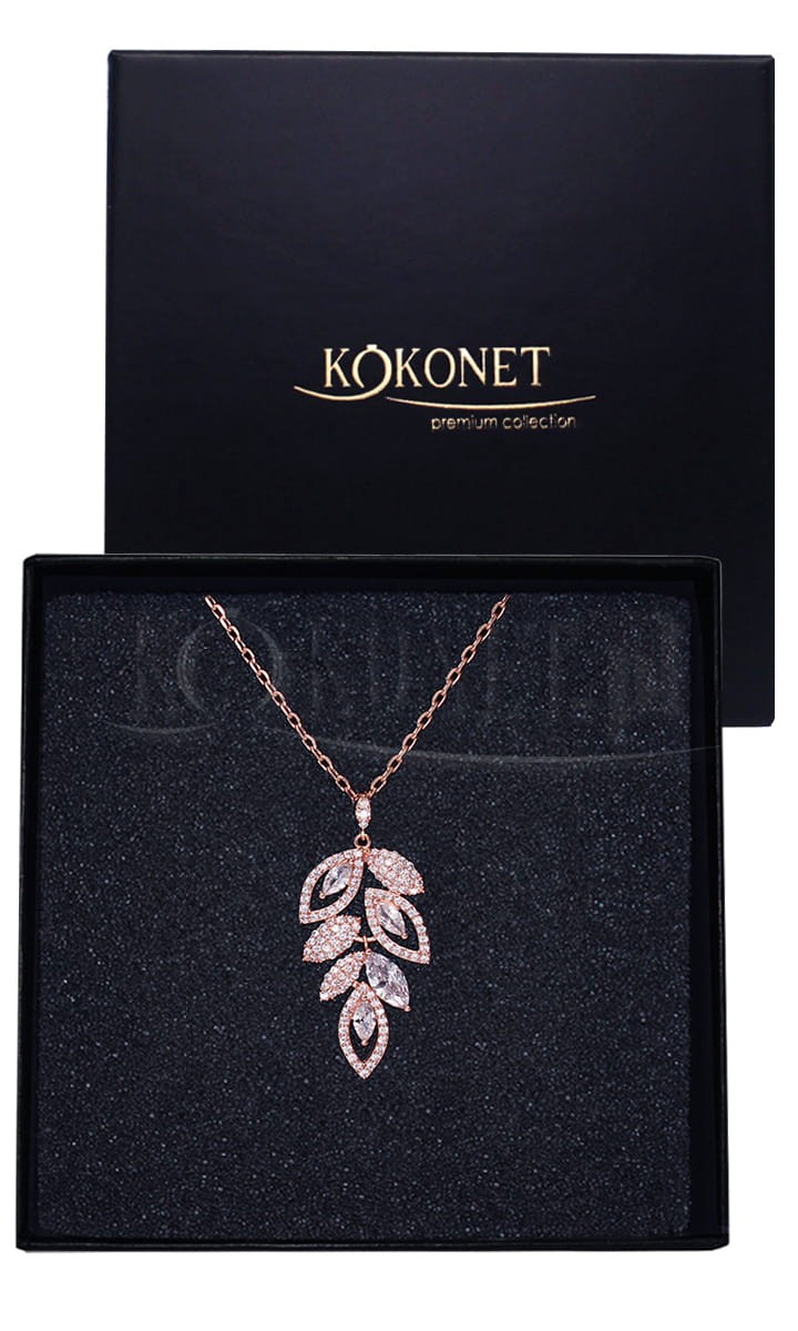 Naszyjnik DALMA w kolorze różowego złota składa się z regulowanego łańcuszka i zawieszki w kształcie ażurowego listka wysadzanego wieloma błyszczącymi cyrkoniami. Naszyjnik pięknie podkreśli wycięte dekolty. Twoja suknia posiada rustykalne aplikacje? ten naszyjnik idealnie będzie do nich pasował. Na końcu strony znajdziesz specjalnie zaprojektowane kolczyki i bransoletkę z tej samej serii.