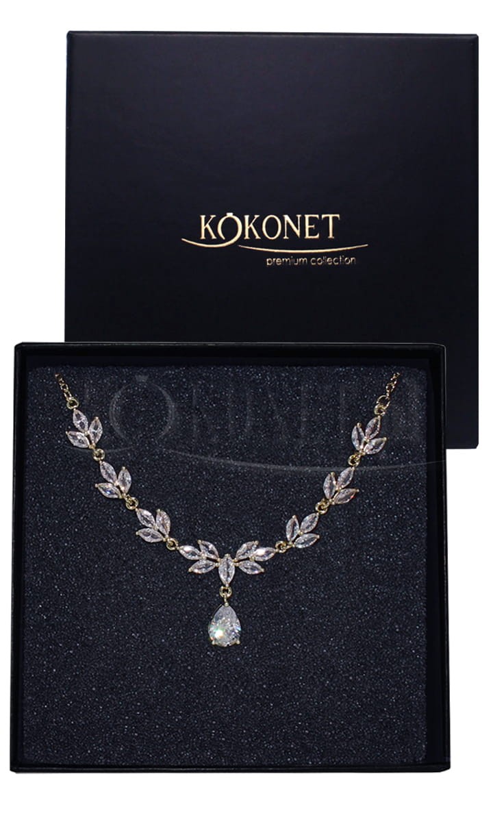 Poszukiwany elegancki złoty naszyjnik na ślubne przyjęcie? Spójrz tylko na model EVIA – delikatne cyrkoniowe listki z zaakcentowanym środkiem w postaci łezki subtelnie ozdabiają dekolt uzupełniając stylizację o piękną biżuterię wspaniale odbijającą światło. Możesz go regulować więc z powodzeniem dopasujesz do do swoich potrzeb.