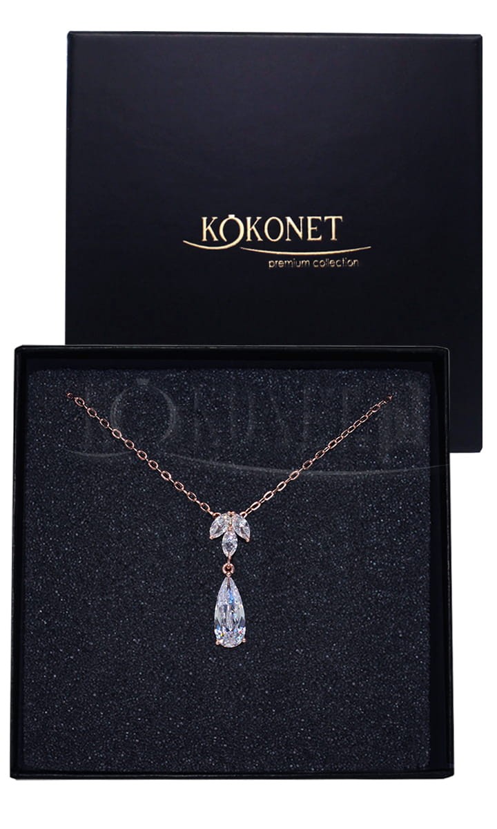 Subtelny, naszyjnik ślubny ROSIE rose będzie stanowił eleganckie dopełnienie stylizacji do kolczyków z tej samej serii - urokliwe listki na regulowanym łańcuszku ozdobią zarówno pięknie wycięte dekolty, jak i skromne suknie podkreślając ich delikatność.