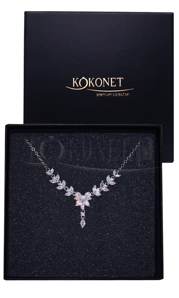 Srebrny naszyjnik TILLY wybierz do sukni ślubnej z wyciętym dekoltem w literkę „V”, aby elegancko go przyozdobić cyrkoniami w kształcie listków. Do tego dobierz równie delikatne kolczyki i efektowna stylizacja gotowa.