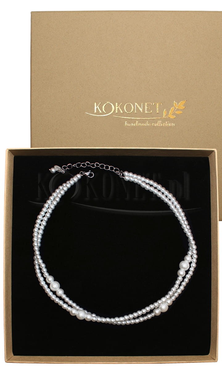 Ozdobny, ale niesamowicie elegancki i zarazem klasyczny perłowy choker wybiorą miłośniczki stylu vintage lub ponadczasowej elegancji. Przekładane rzędy pereł z ciekawym ułożeniem pereł w sznurze doda pazura Twojej stylizacji. Założysz go z powodzeniem do odkrytej sukni ślubnej z obniżonym gorsetem czy do sukni z opadającymi ramiączkami, a także do garnituru ślubnego.