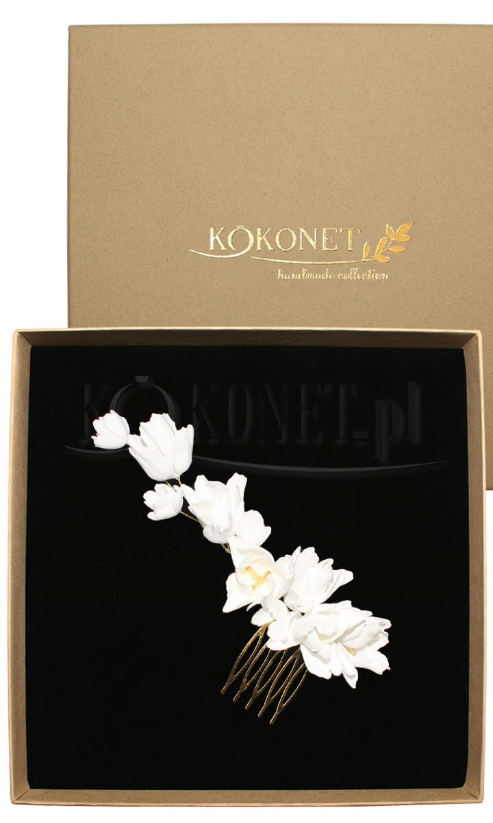 Złoty kwiatowy grzebyk do włosów FRESJA gold nada wyjątkowości każdej eleganckiej fryzurze. Mocowany na jednym końcu za pomocą grzebyka , dlatego świetnie sprawdzi się do fryzur typu french twist, upięcie boczne, czy asymetryczny kok. Piankowe kwiaty możesz dowolnie dostosować dzięki giętkiemu drucikowi z którego zostały wykonane. Twoja stylistka z tą ozdobą do włosów wyczaruje absolutnie zjawiskową fryzurę na ślub.