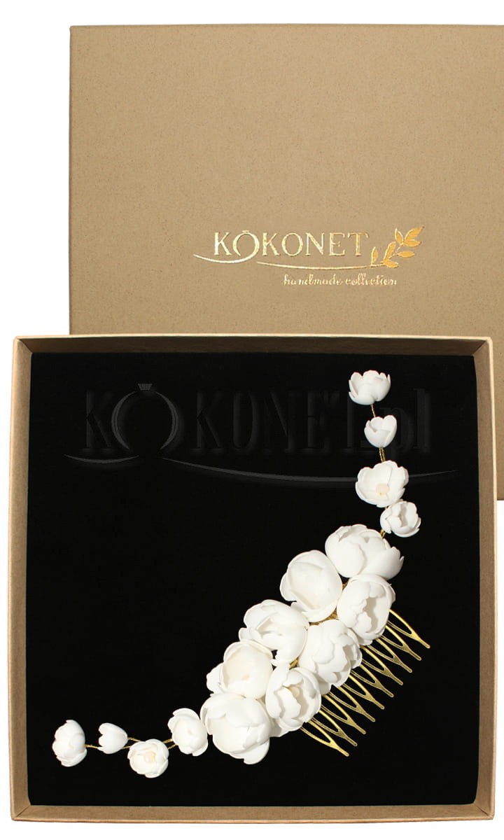 Grzebyk LIDIA to propozycja na kwiatową ozdobę ślubną do włosów głównie przeznaczona do niskich upięć, lub włosów rozpuszczonych. Grzebyk ukwiecony jest po same końce kwiatami w kształcie piwonii, tak chętnie wybieranych do ślubnych bukietów. Z pewnością podkreśli i dopełni każdą romantyczną stylizację ślubną z motywem florystycznym.
