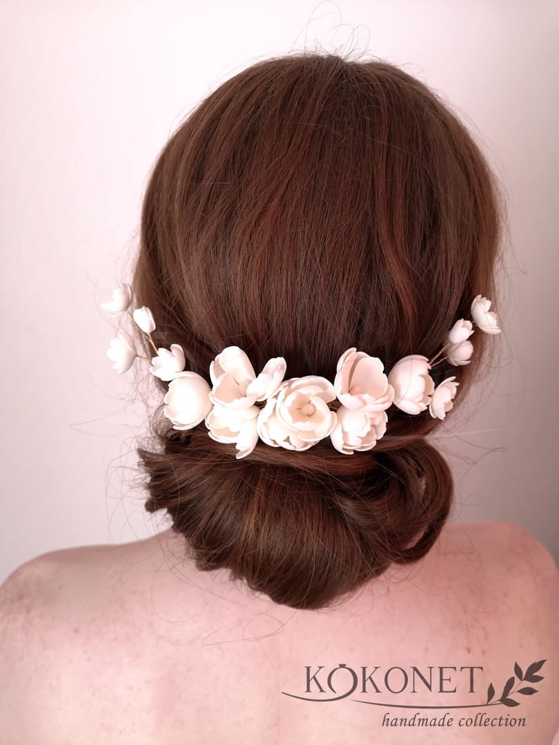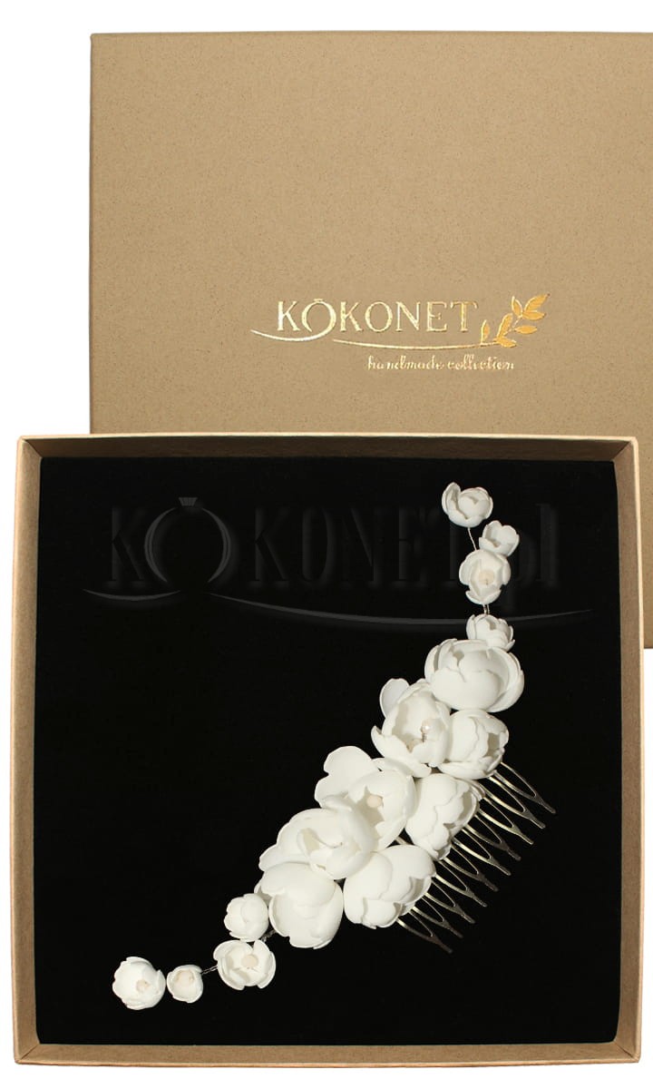 Grzebyk LIDIA to propozycja na kwiatową ozdobę ślubną do włosów głównie przeznaczona do niskich upięć, lub włosów rozpuszczonych. Grzebyk ukwiecony jest po same końce kwiatami w kształcie piwonii, tak chętnie wybieranych do ślubnych bukietów. Z pewnością podkreśli i dopełni każdą romantyczną stylizację ślubną z motywem florystycznym.